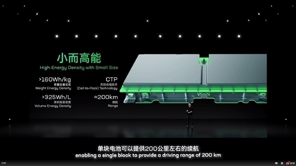 该电池采用宁德时代最新CTP技术,“巧克力换电块”重量能量密度超过160Wh/kg,体积能量密度超过325Wh/L,单块电池可以提供200公里左右的续航,并可以适配全球80%已经上市以及未来3年要上市的纯电平台开发的车型。