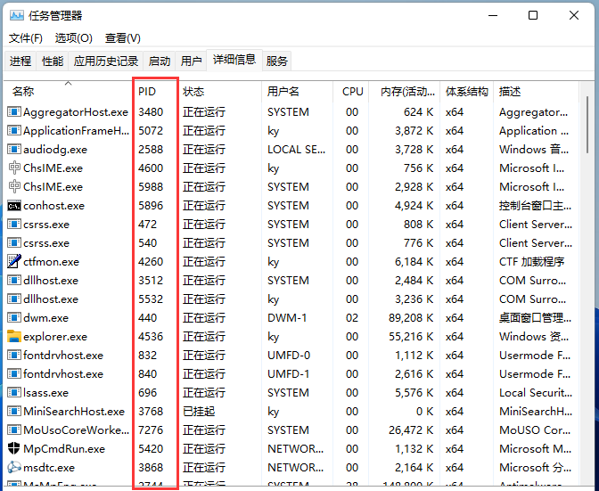 5、想要找到是哪个程序占用了端口号,可以记下最后一列的PID数字;