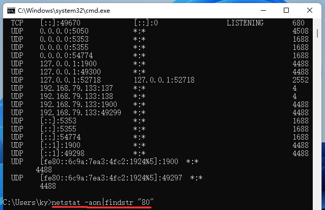 4、如果想要查找特定的端口,可以输入并回车执行 netstat -aon|findstr “端口号” 命令,例如:netstat -aon|findstr “80”,即为查找端口号为80的信息;