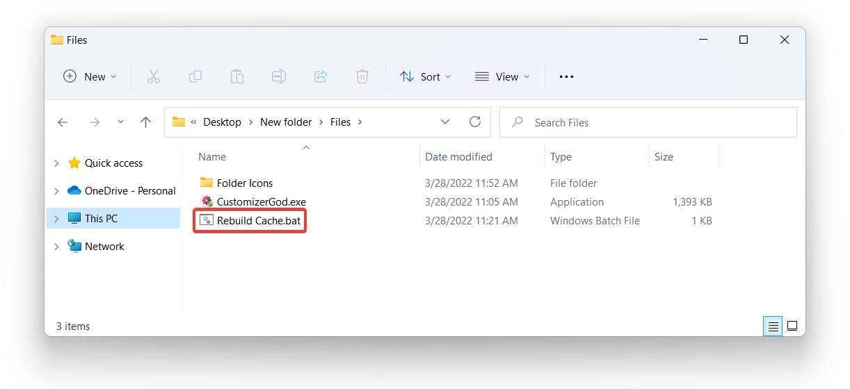 在某些情况下,新的缩略图可能仍然不起作用。打开您在 ZIP 存档中下载的Rebuild Cache.bat文件以解决问题。之后无需重新启动计算机。