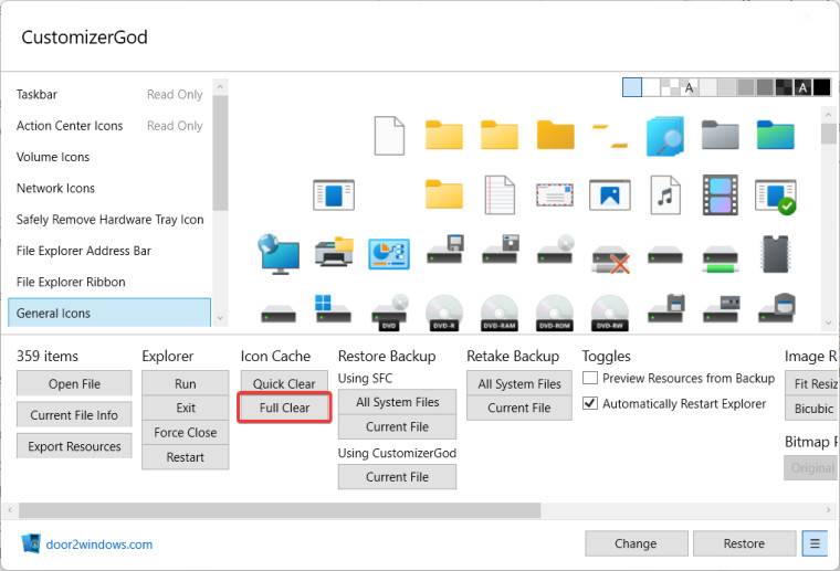 此时,您应该已应用更改。如果 Windows 11 仍显示默认缩略图样式,请单击图标缓存部分中的完全 清除按钮以强制重建图标缓存并使用新的缩略图样式。