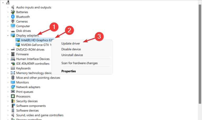 现在展开显示适配器部分并右键单击您获得的每个驱动程序以选择更新驱动程序。