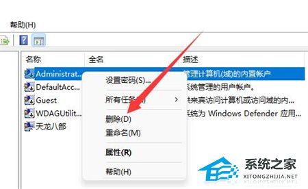 5. 在用户中找到“administrator”用户,右键选中它点击“删除”。