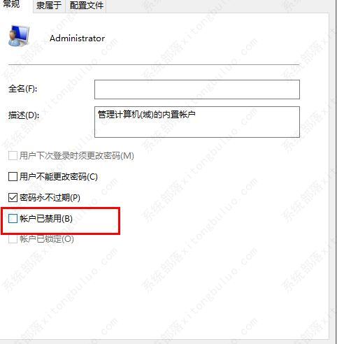4、将“常规”中的“账户已禁用”前面的√取消。