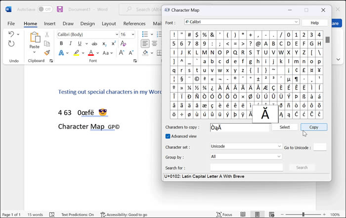 单击复制按钮并在准备好后将特殊字符粘贴到文档中。
