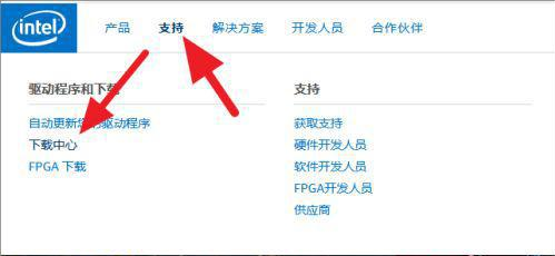 2. 进入英特尔官网后,点击导航栏的【支持】按钮,再点击下方的【下载中心】文字。