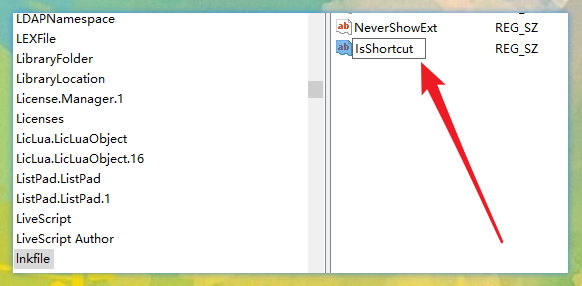 3. 右击linkfile,新建一个字符串值,命名为IsShortcut,不必修改数值。