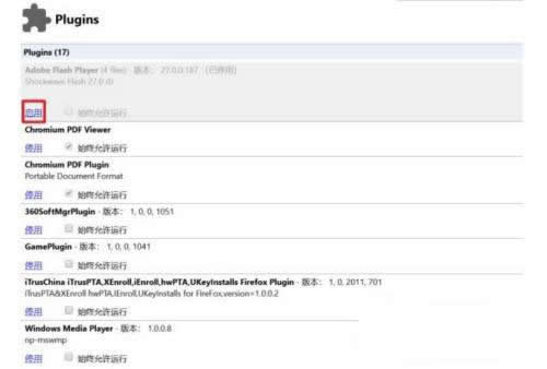 6. 我们在列表中找到“adobe flash player”插件,将其点击“启用”。
