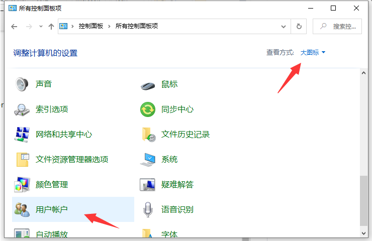 1、在开始菜单上单击右键,选择【控制面板】打开,然后改成大图标,点击【用户账户】。(或者直接开始菜单内查找也可以找到控制面板)