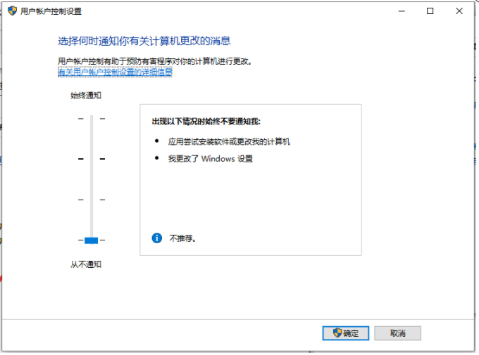 3、把滑条拉到最下面“从不通知” 点击【确定】重启电脑即可。