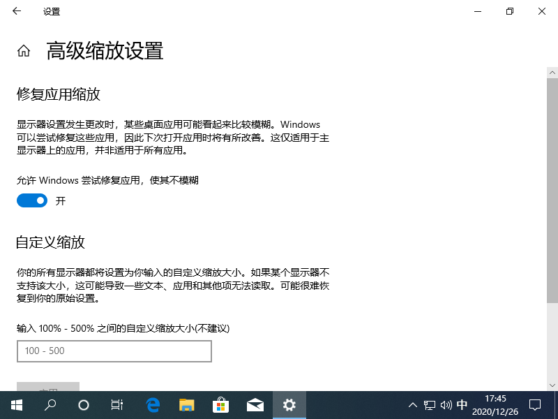 3、然后打开“高级缩放设置”,开启“允许windows尝试修复应用,使其不模糊”,并在下方的输入框中输入你在上方选择框看到的数字,点击应用。