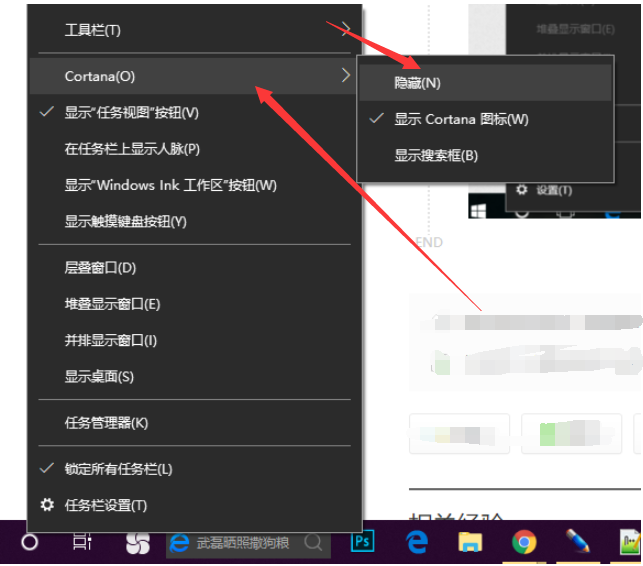 3. 如果想要显示或者隐藏小娜,就直接右击任务栏,选择小娜,点击隐藏和显示就可以啦。