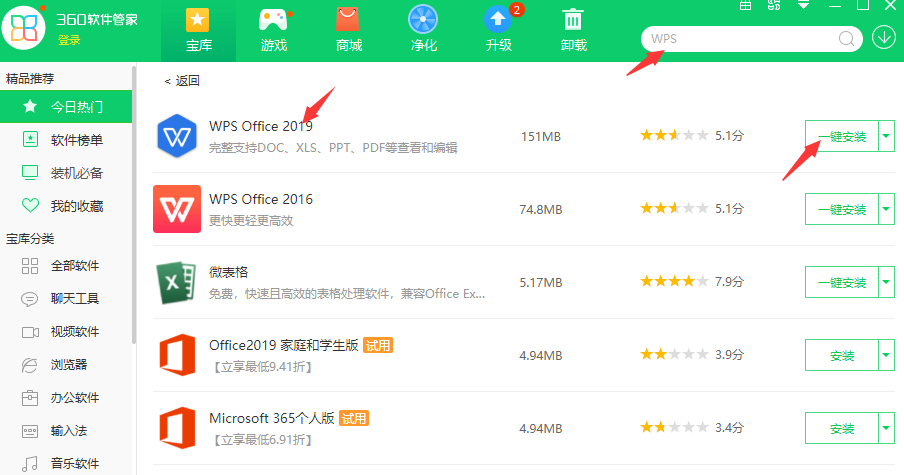 2. 在软件管家搜索框搜索WPS,点击下载,如下图。