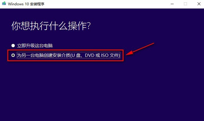 6、你想执行什么操作,我们选择为另一台电脑创建安装介质,不要选错了,不然就更新你的电脑了。