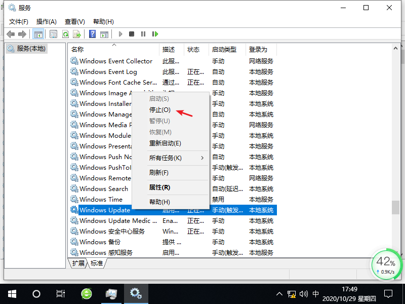 3、接着我们右键并找到windows update,选择停止选项。