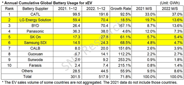 纵观全球市场,2022年全球动力电池装机量排行榜中前十名的企业全部为中日韩三国的企业。