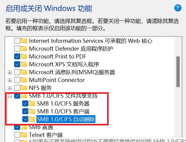 5、Windows 功能窗口,找到并点击+号,展开SMB 1.0/CIFS 文件共享支持;