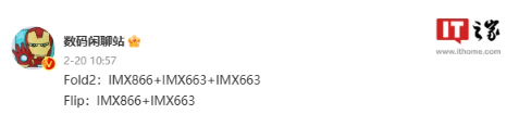 除此之外,该博主此前爆料称,vivo X Fold 2 将采用 IMX866+IMX663+IMX663 三摄,而 vivo X Fold Flip 则将采用 IMX866+IMX663 双摄。