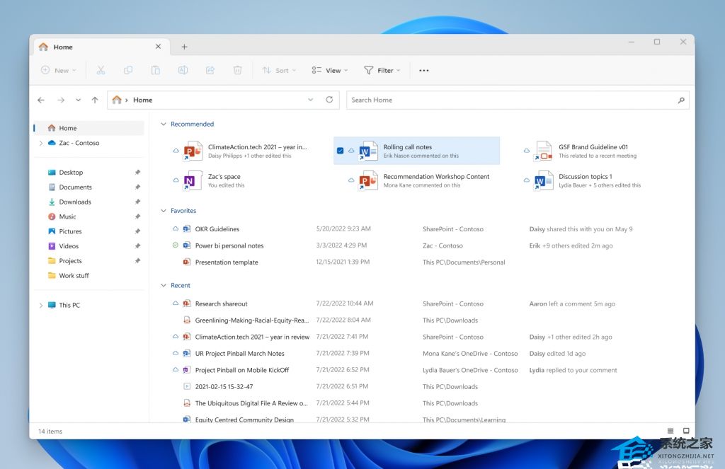 File Recommendations 即将出现在 File Explorer Home 中,让用户最相关的文件内容触手可及。使用 Azure Active Directory (AAD) 帐户登录 Windows 的用户将可以使用此功能(如下图所示)。推荐的文件将是与该帐户关联的云文件,或者由用户拥有,或者与用户共享。