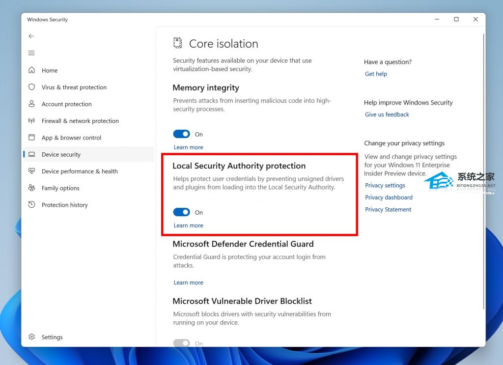 本地安全机构 (LSA) 保护通过防止未经授权的代码在 LSA 进程中运行以及防止进程内存转储,帮助防止用于登录的机密和凭据被盗。从升级开始,我们将审计一段时间以检查与 LSA 保护的不兼容性。如果我们没有检测到任何不兼容性,我们将自动打开 LSA 保护。您可以在 Device Security > Core Isolation 页面下的 Windows Security 应用程序中检查和更改 LSA 保护的启用状态。