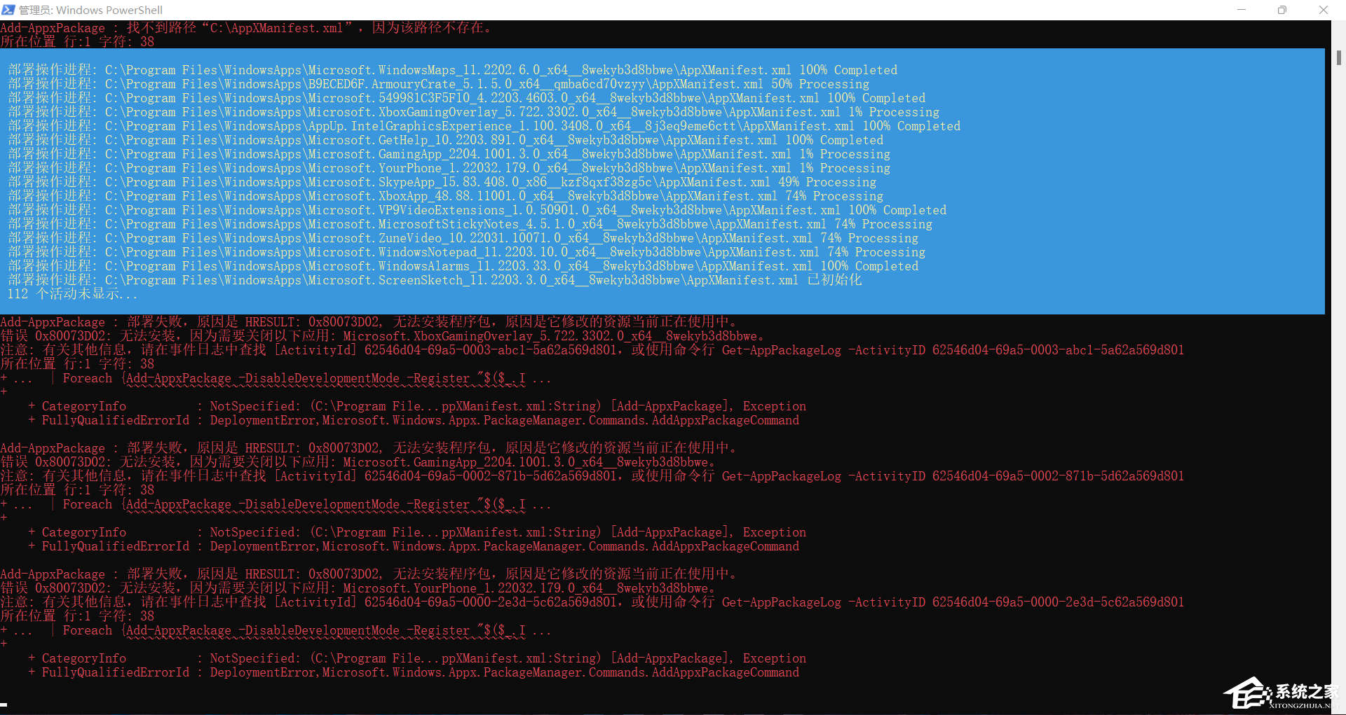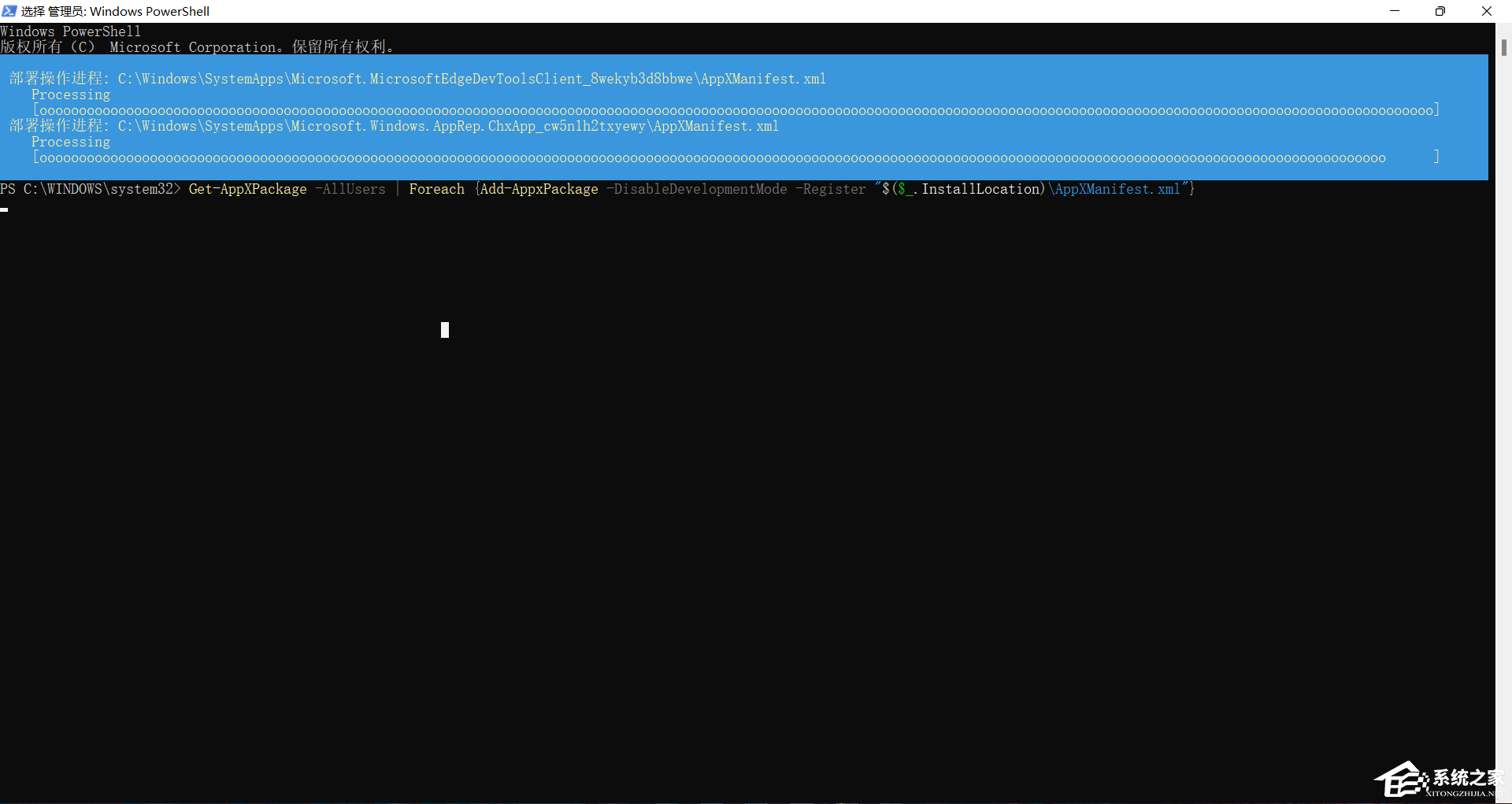 三、输入Get-AppXPackage -AllUsers | Foreach {Add-AppxPackage -DisableDevelopmentMode -Register “$($_.InstallLocation)\AppXManifest.xml”},并回车。