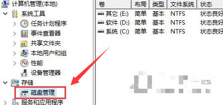 2、在确认新磁盘分区没有系统文件后,选择存储栏目下的磁盘管理按钮