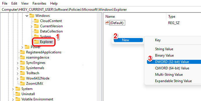 第 4 步:将新创建的密钥命名为Explorer。通过单击确保新创建的Explorer键是选定的键。