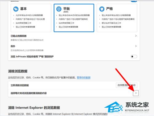 在隐私中点击选择每次关闭浏览器时要清除的内容。