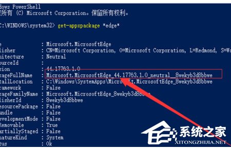 6、输入代码,输入【remove-appxpackageMicrosoft.MicrosoftEdge_44.17763.1.0_neutral__8wekyb3d8bbwe】并在键盘上按回车键。