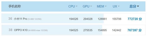 1、搭载了这两款处理器的手机安兔兔跑分都在77万分左右。