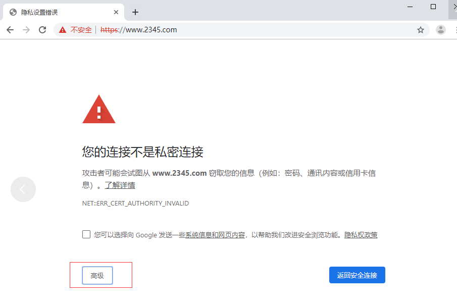 第四步:重新打开浏览器,如果该劫持网站是https的,会有警告,点击高级按钮(以谷歌为例),再选择继续前往。
