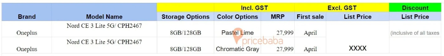 【本站】3月27日消息,据国外科技媒体 Pricebaba 报道,一加 Nord CE 3 Lite 5G 手机将会推出 Pastel Lime 和 Chromatic Gray 两种颜色,8GB+128GB 版本售价为 27999 卢比,预计欧洲市场售价为 329 欧元。需要注意的是,图片中的售价为最高零售价,实际市场售价应该会低于该价位。