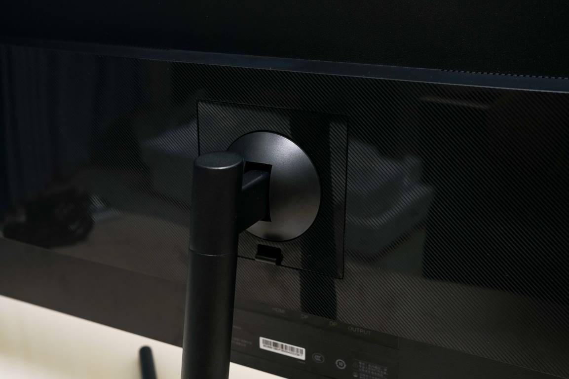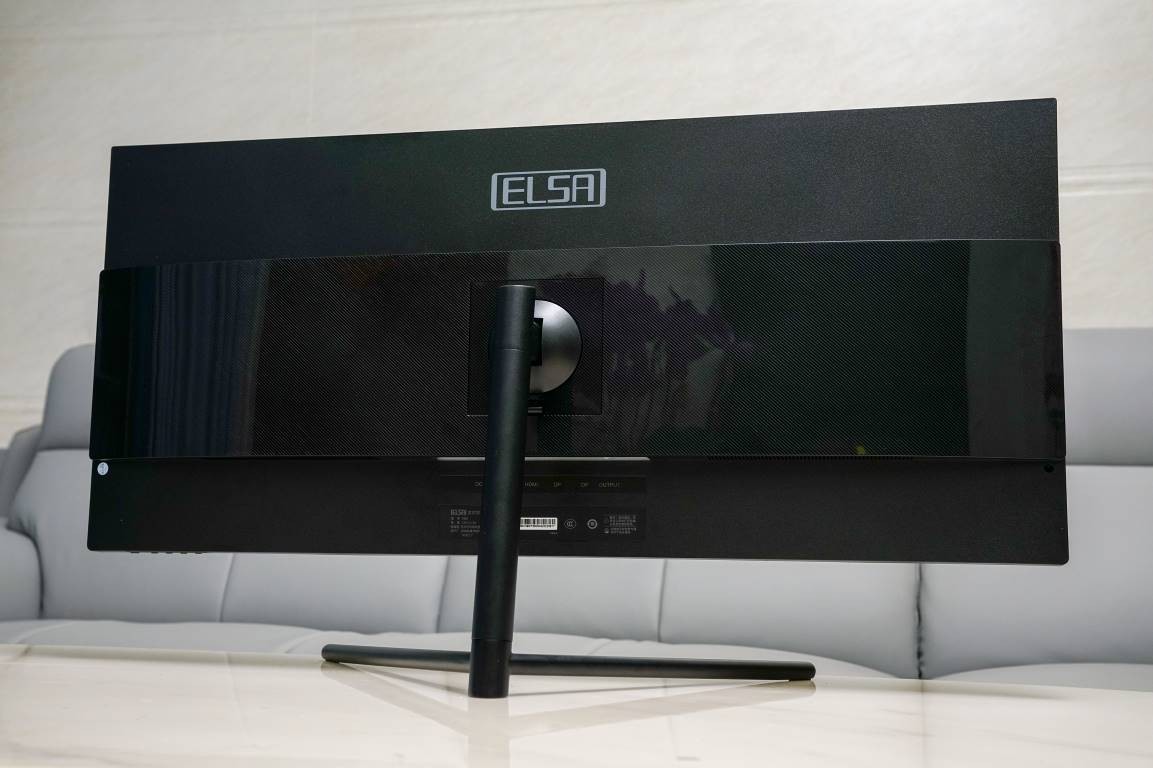 在显示器的背面这里,艾尔莎34G1使用的是三段式设计,中间凸起的部分是亮面的斜线纹理造型,整体看起来很有质感。