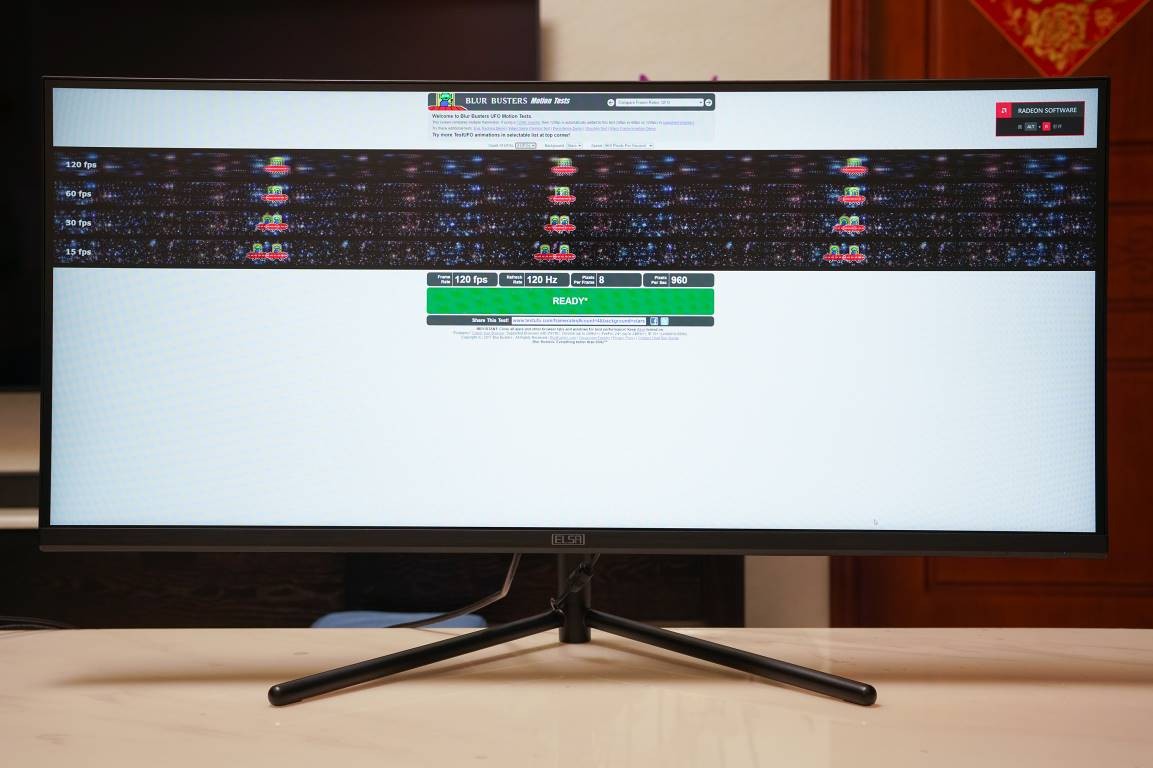 看完显示器的外观和细节之后,接下来就是开机实测的部分,首先是UFO Test,艾尔莎34G1的120Hz刷新率以及FreeSync技术让画面有着良好的流畅度,肉眼观察并无明显拖影。