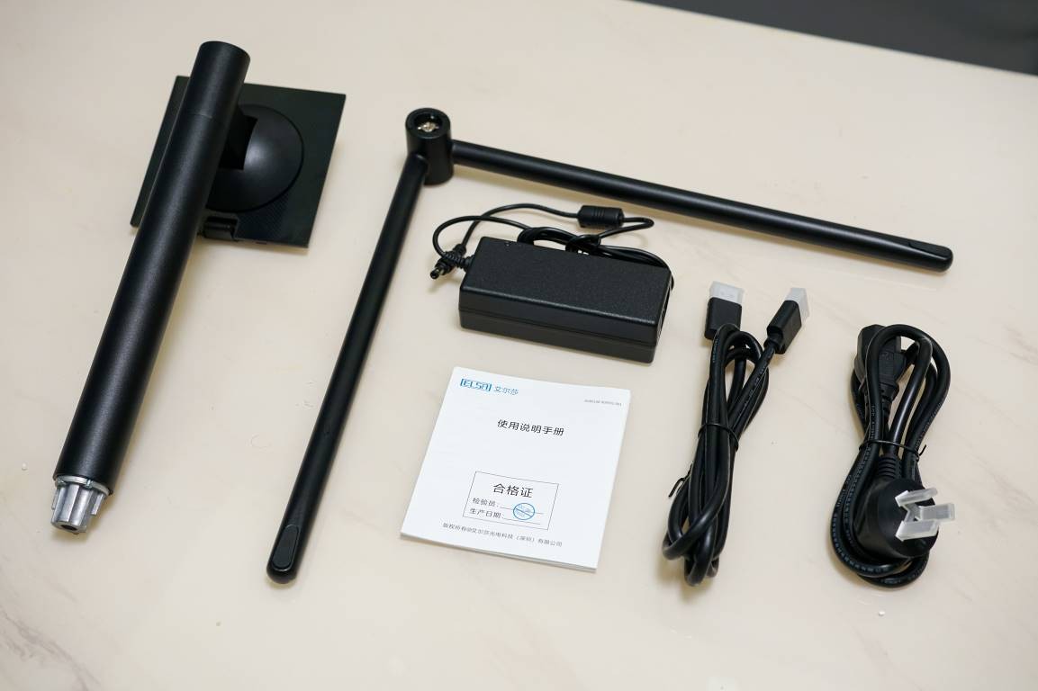 显示器的配件一览,里面有全金属的支架、电源适配器、电源线、DP线以及用户使用手册。
