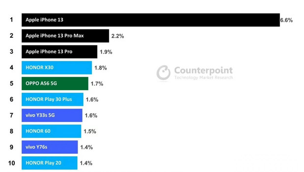 在最畅销的十款机型中,iPhone 13、iPhone 13 Pro Max和iPhone 13 Pro分列前三,这表明苹果在中国市场上的影响力仍然很大。此外,荣耀在榜单中有四款机型,vivo有两款机型,OPPO有一款机型,这也表明了这些品牌在中国市场上的竞争力。