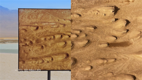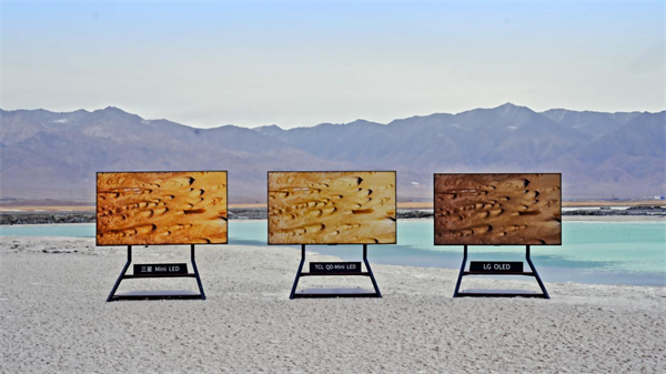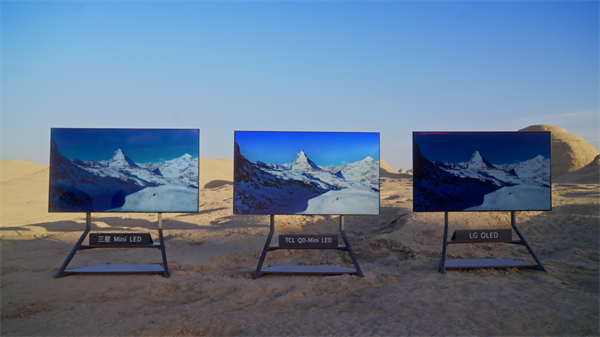 TCL QD-Mini LED电视明显是最亮的、细节保留最好;三星Mini LED更暗一些、画面右侧的山峰看起来更平了;LG OLED电视最暗、左侧暗处的山峰几乎都已经看不见了。