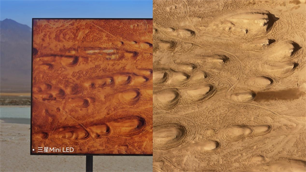 电视峰值亮度不够的时候,为了表现好这样的画面、还原物体在阳光照射下的「自然的鲜艳」,就会在调教时提高颜色的饱和度,出来的效果可能就会像这张图里的三星Mini LED电视的画面一样——艳丽但偏离现实。