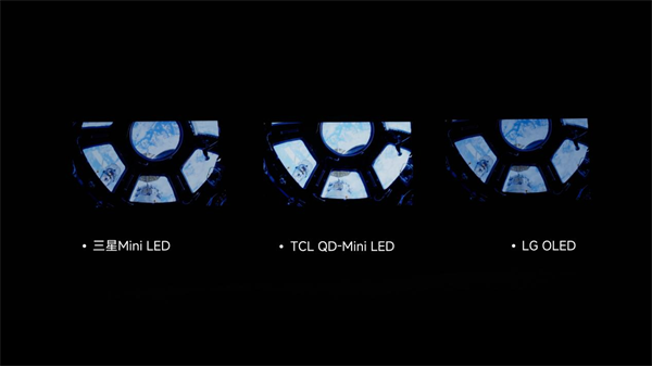 中间的TCL 优势还在持续,亮得最好,夜空中的繁星数量最多,而且地球的云朵看起来也最厚、最饱满立体。同时背景的黑也hold住了。