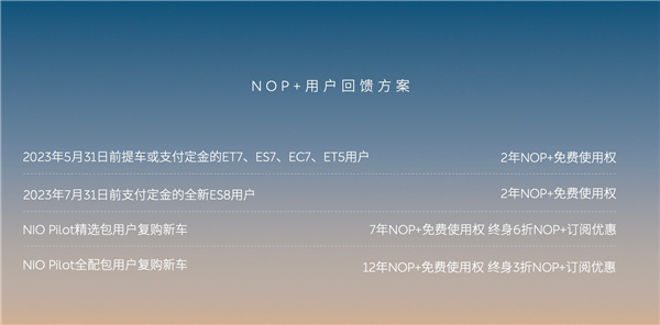 除了换电权益外,蔚来的高阶辅助驾驶系统NOP+权益也做了相关调整。NOP+ Beta免费试用将于今年6月30日结束,7月1日起,NOP+将升级为正式版并开启订阅,订阅价格为380元/月。5月31日之前购买ET7/ES7/EC7/ET5的用户,7月31日前支付定金的ES8用户拥有2年NOP+免费使用权。此外,小NP用户复购新车,送“7年NOP+免费使用”和“终身6折NOP+订阅”;大NP用户复购新车,送“12年NOP+免费使用”和“终身3折NOP+订阅”。