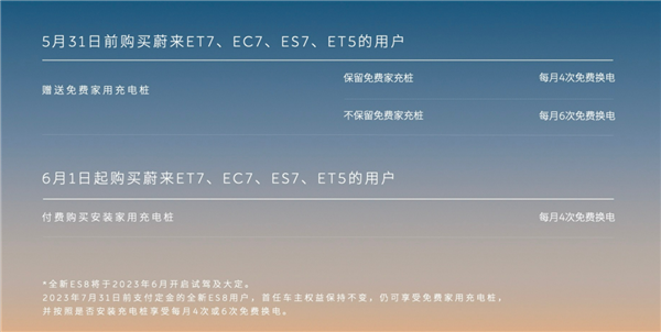 【本站】4月10日消息,据蔚来App消息,蔚来公司将对购买蔚来ET7、EC7、ES7、ET5的用户的首任车主权益进行调整。这些调整包括:6月1日起,家用充电桩将调整为付费购买安装,每月免费换电次数统一调整为4次。需要注意的是,如果在5月31日之前购买ET7/ES7/EC7/ET5,用户仍有“4次/月换电+免费家桩”和“6次/月换电+付费家桩”的选择。