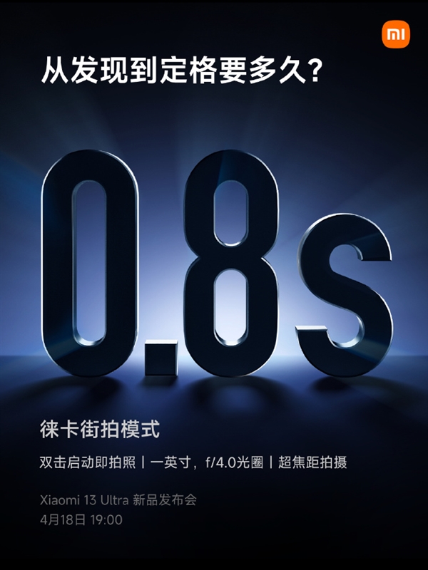 【本站】4月14日消息,小米手机今日宣布将于4月18日19点开启小米13 Ultra的定档。该款手机新增了徕卡街拍模式,只需双击即可启动,抓拍速度可达0.8秒,让每一个美好瞬间都能得以保留。