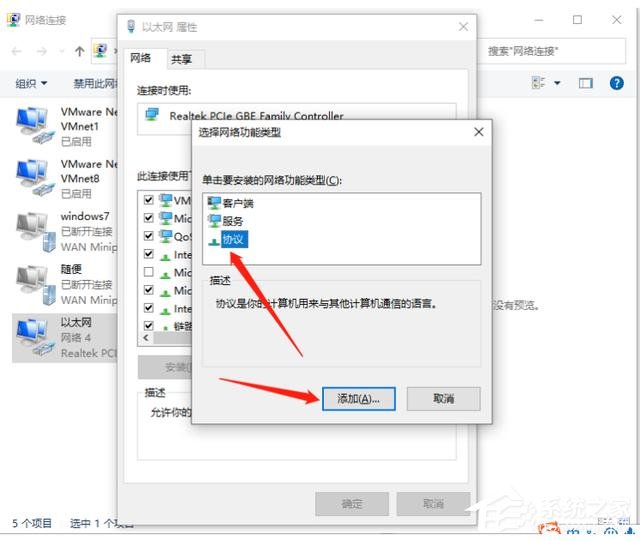 4、选择弹出网络功能栏中的【协议】;