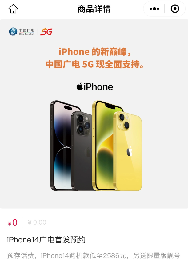 中国广电公布iPhone 14合约套餐价格,最低购机款2586元