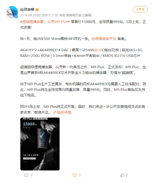 【本站】4月24日消息,据山灵官方微博今日发布的消息,山灵M9 Plus便携式音频播放器定价15980元,全球限量999台,并将于5月上旬正式发售。需要注意的是,该产品首批仅支持线下购买。