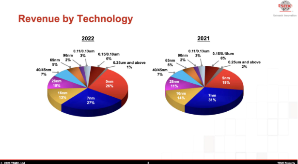 【本站】5月6日消息,据台积电年度报告显示,2022年半导体行业整体放缓,但台积电的12英寸等效晶圆出货量仍同比增长7.7%,达到1530万片。其中,先进芯片制造技术(7纳米以下)的晶圆占总组合的53%,较去年的50%有所增长。台积电的出货量占全球非存储器半导体产品的30%,份额增加了4个百分点。