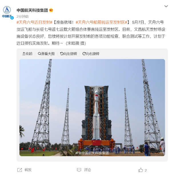 【本站】5月7日消息,今天,天舟六号货运飞船与长征七号遥七运载火箭组合体垂直转运至发射区,文昌航天发射场设施设备状态良好。据本站了解,天舟六号货运飞船计划在近日择机实施发射。这将是中国空间站进入应用与发展阶段后的首次飞行任务,为我国空间站投送70公斤水果等物资。