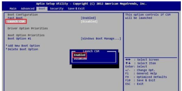 a、开机按 F2键进入BIOS界面后,通过方向键选择【Boot】--Launch CSM --选择 Enabled。