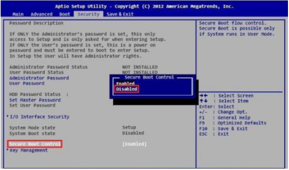 【Security】--Secure Boot Control--选择Disabled;然后F10保存 退出。