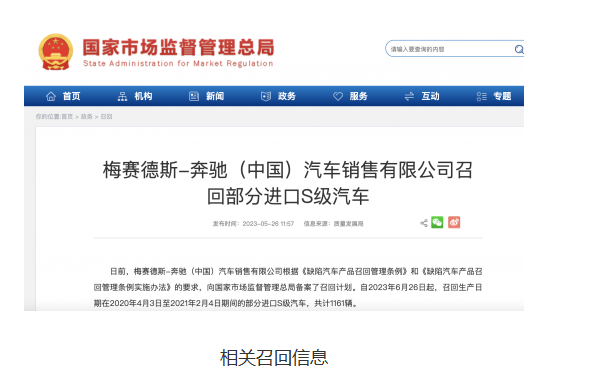 【本站】5月26日消息,梅赛德斯-奔驰(中国)汽车销售有限公司今天根据《缺陷汽车产品召回管理条例》和《缺陷汽车产品召回管理条例实施办法》的要求,向国家市场监督管理总局备案了一项召回计划。该计划将涉及部分进口S级汽车,召回总计1161辆,生产日期在2020年4月3日至2021年2月4日期间。